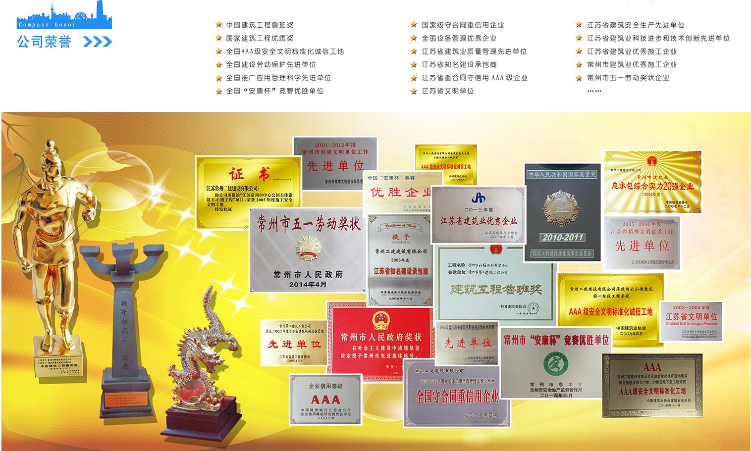 公gong司si六liu十shi多duo年nian來lai為wei常chang州zhou城cheng市shi建jian設she和he經jing濟ji發fa展zhan作zuo出chu了le貢gong獻xian。在zai建jian築zhu業ye改gai革ge進jin程cheng中zhong,公gong司si施shi工gong能neng力li和he生sheng產chan規gui模mo得de到dao了le進jin一yi步bu發fa展zhan,先xian後hou承cheng建jian了le常chang州zhou體ti育yu館guan、常州工業展覽館、常州大酒店、常州亞細亞影城、中油國際大酒店等一大批有影響的高、大、難項目,並創三十餘項省質優工程和揚子杯獎,多項工程獲國家 級“安康杯”和AAA 級安全文明標準化誠信工地。公司施工的紅梅西村棋區住宅小區在早年被評為“魯班獎”工程,常州城市應急中心被評為2010—一2011年度常州地區的我國好的。